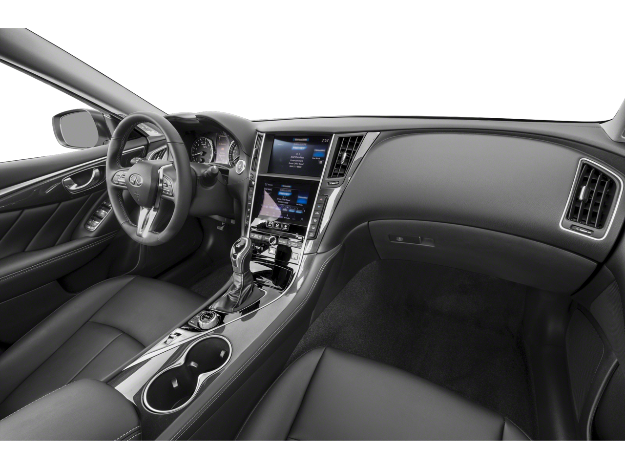 - Radio: INFINITI InTouch w/Navigation -inc: 16 speaker Bose Performance Series audio w/Bose Centerpoint simulated surround, dual HD display, navigation w/lane guidance, 3D building graphics, premium traffic and MapCare, voice recognition for navigation functions, including 1-shot voice destination entry, wireless Apple CarPlay, Siri Eyes Free, Android Auto, Bluetooth® hands-free phone system w/text messaging assistant, voice recognition for audio, Bluetooth® and vehicle information, streaming audio via Bluetooth®, 2 illuminated USB connection ports (1 type A, 1 type C), auxiliary audio input, HD Radio, SiriusXM radio w/advanced audio features w/3 month complimentary trial, SiriusXM Traffic w/3 month complimentary trial access to real-time traffic information, SiriusXM Travel Link w/3 month complimentary trial access to weather, fuel prices, stock prices, sports scores, movie listings and parking and Wi-Fi hotspot